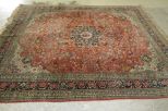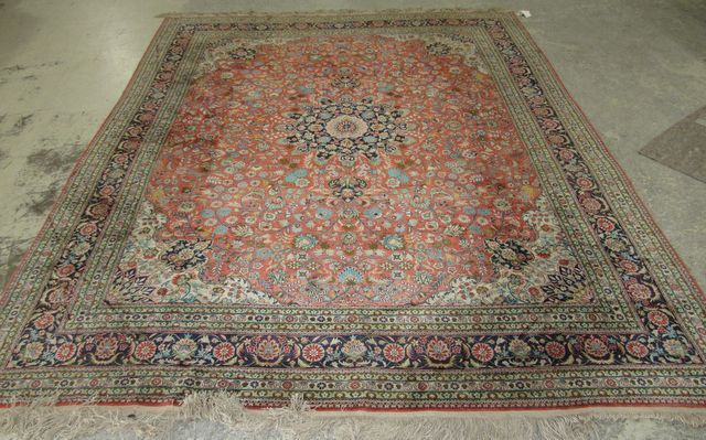 Low pile hand made with wool and silk, good condition, 8' x 9'. Low pile hand made with wool and silk, good condition, 8' x 9'.