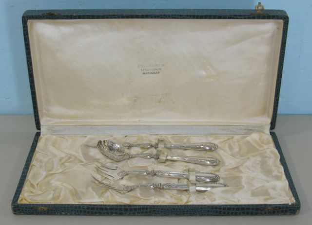 Sterling serving forks 7", spoon, butter knife, ornate pattern, has French marks, from Pellegrin Marseille store. Sterling serving forks 7", spoon, butter knife, ornate pattern, has French marks, from Pellegrin Marseille store.