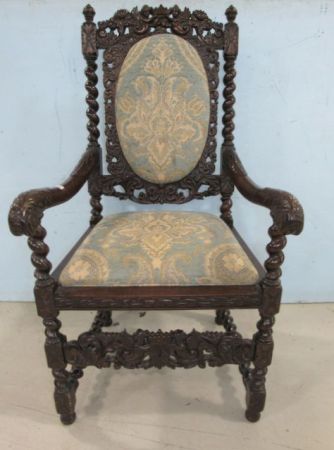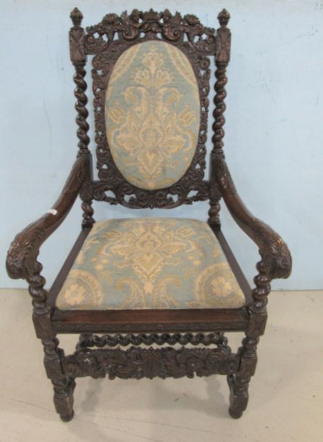 Carved English barely twist arm chair, carved angels on crest and bottom stretcher, upholstery seat and back, frame needs tightening, 45"h. Carved English barely twist arm chair, carved angels on crest and bottom stretcher, upholstery seat and back, frame needs tightening, 45"h.