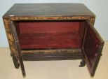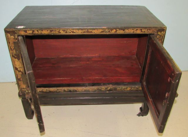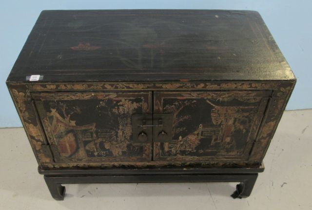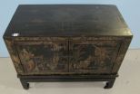 Two door storage chest on stand, two pieces, has Japanese hand design scene, has chips and scuffs on piece, 26"h., 17"d., 33"w. Two door storage chest on stand, two pieces, has Japanese hand design scene, has chips and scuffs on piece, 26"h., 17"d., 33"w.
