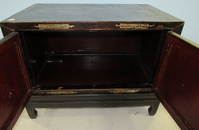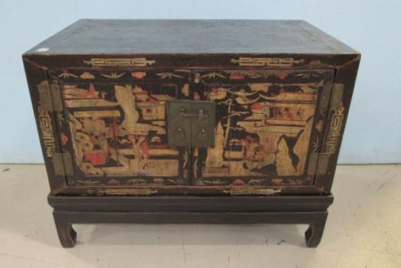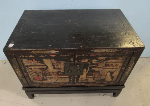 Two door storage chest on stand, two pieces, has Japanese hand design scene, has chips and scuffs on piece and on the top, 26"h., 17"d., 33"w. Two door storage chest on stand, two pieces, has Japanese hand design scene, has chips and scuffs on piece and on the top, 26"h., 17"d., 33"w.