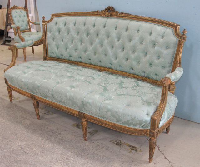 Gold Gilt carved parlor settee, light blue floral pattern fabric, some of the frame has chips on paint, antique gold gilt, 40"h., 72"w., 28"w. Gold Gilt carved parlor settee, light blue floral pattern fabric, some of the frame has chips on paint, antique gold gilt, 40"h., 72"w., 28"w.