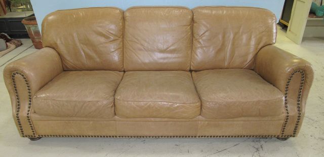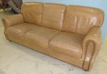 Tacked border, three cushion, has normal leather wear, no brand tag but is well made, 34"h., 7'L. Tacked border, three cushion, has normal leather wear, no brand tag but is well made, 34"h., 7'L.