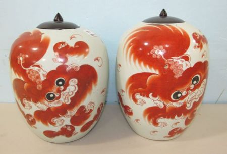 Ceramic ginger jars with red foo dog painted, is mark on bottom, has lids, 11"h. Ceramic ginger jars with red foo dog painted, is mark on bottom, has lids, 11"h.