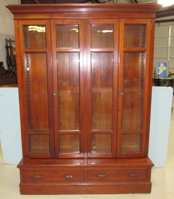 Four glass doors with wood shelves, base with two drawers, two piece, knob turn to lock doors, one knob needs a screw, cone from Belhaven, 84"h., 60"w., 19"d. Four glass doors with wood shelves, base with two drawers, two piece, knob turn to lock doors, one knob needs a screw, cone from Belhaven, 84"h., 60"w., 19"d.