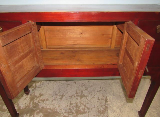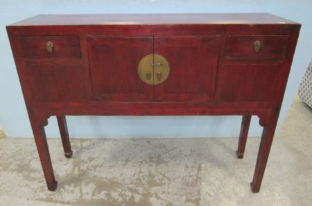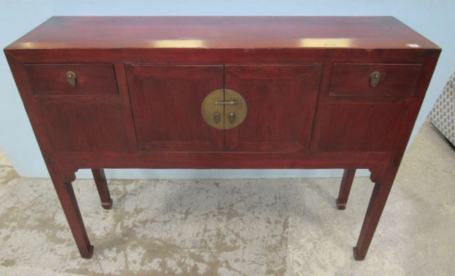Ming style sideboard two drawer, two door storage, brass hardware, tall legs, dove tailed drawers, vintage, 43"h., 55"w., 15"d. Ming style sideboard two drawer, two door storage, brass hardware, tall legs, dove tailed drawers, vintage, 43"h., 55"w., 15"d.