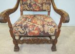 English carved wood frame with paw feet, ornate front stretcher, floral pattern fabric, 44"h. English carved wood frame with paw feet, ornate front stretcher, floral pattern fabric, 44"h.