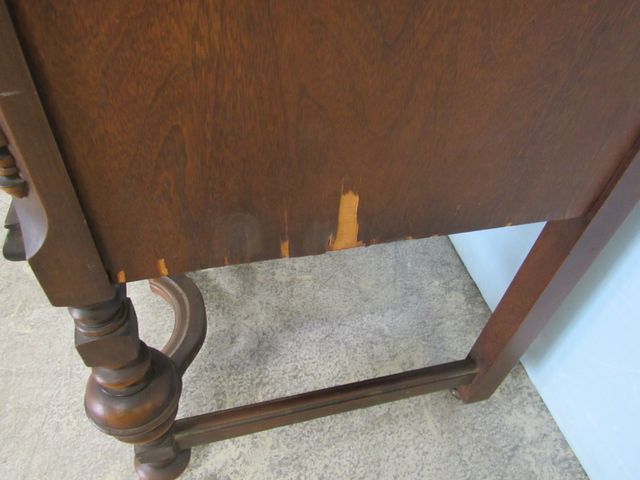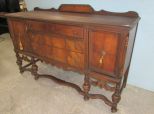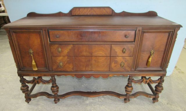 Depression era buffet, three drawer and two door, on wheels, has veneer missing on sides, 43"h., 66"w., 21"d. Depression era buffet, three drawer and two door, on wheels, has veneer missing on sides, 43"h., 66"w., 21"d.