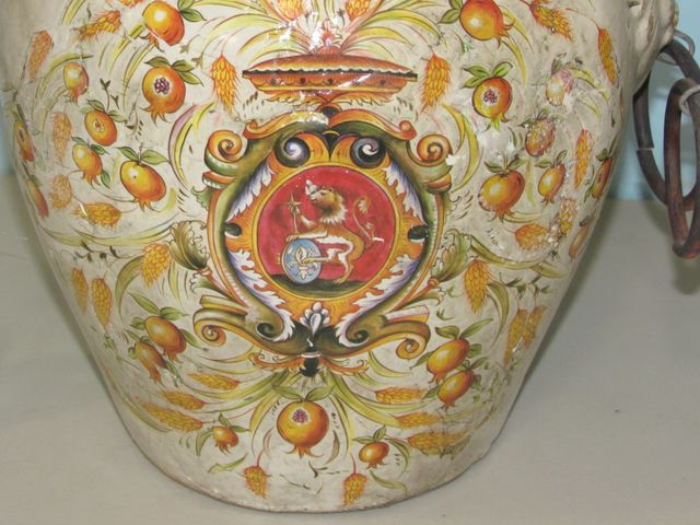 Modern decor pottery urns painted white with fruit and loin crest design, has some small chips, also has two metal round handles, 12"h. Modern decor pottery urns painted white with fruit and loin crest design, has some small chips, also has two metal round handles, 12"h.