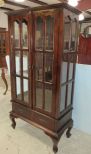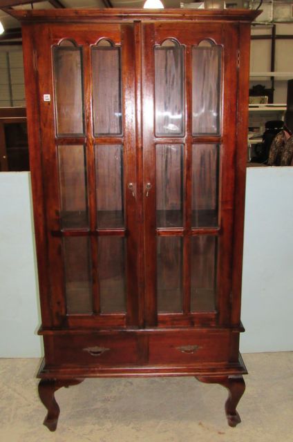 Two shelves, glass doors, two drawers, legs on wheels, reproduction with peg design, 74"h., 35"w., 17"d. Two shelves, glass doors, two drawers, legs on wheels, reproduction with peg design, 74"h., 35"w., 17"d.