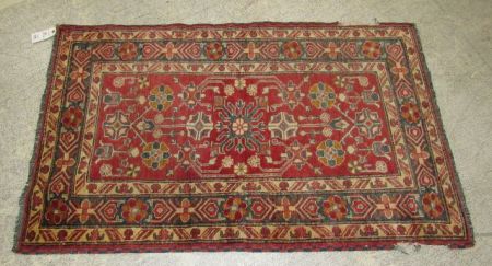 Low pile hand made with wool, has wear and damaged on ends, 2'8 x 4'4. Low pile hand made with wool, has wear and damaged on ends, 2'8 x 4'4.