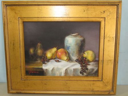 Oil painting on canvas of fruit and vase, gold gilt wood frame, 20"h., 24"w. Oil painting on canvas of fruit and vase, gold gilt wood frame, 20"h., 24"w.