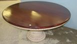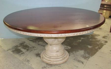 French Style Wood top and white distressed pedestal base, top is removable, 31"h., 60"dia. French Style Wood top and white distressed pedestal base, top is removable, 31"h., 60"dia.