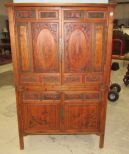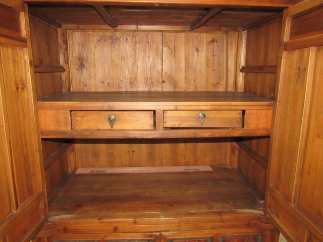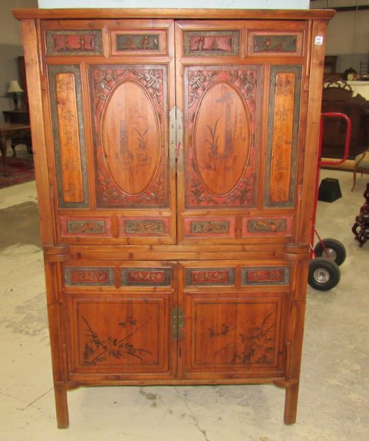 Two pieces, ornate carving, modern piece, top shelves with drawer, double bottom drawers with shelf, 66"h., 41"w., 21"d. Two pieces, ornate carving, modern piece, top shelves with drawer, double bottom drawers with shelf, 66"h., 41"w., 21"d.