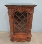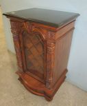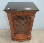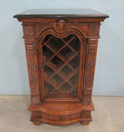 Modern piece, English style, glass door, goat crest, one drawer, faux marble top, minor wear on finish, 39"h., 23"w., 18"d. Modern piece, English style, glass door, goat crest, one drawer, faux marble top, minor wear on finish, 39"h., 23"w., 18"d.