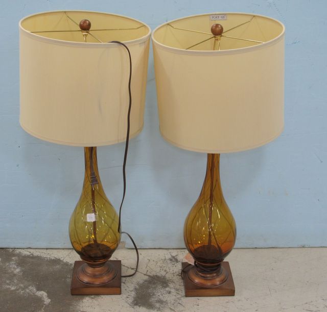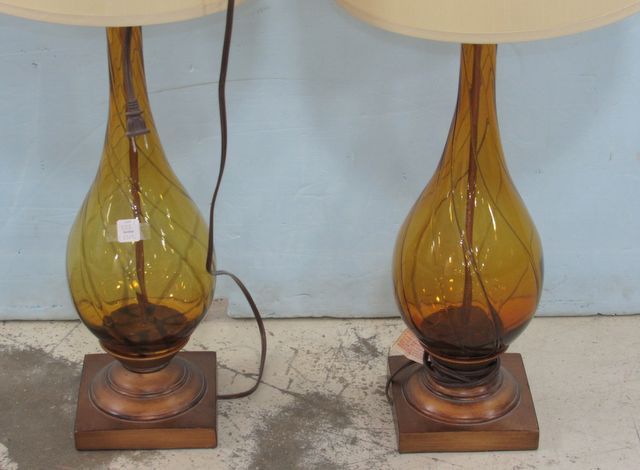 Modern amber color lamps with swirl pattern and resin base, 35"h. Modern amber color lamps with swirl pattern and resin base, 35"h.