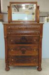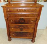 Six drawers, flame mahogany, screw on mirror, has finish wear, some scratches, 47"h., 36"w., 22"d. Six drawers, flame mahogany, screw on mirror, has finish wear, some scratches, 47"h., 36"w., 22"d.