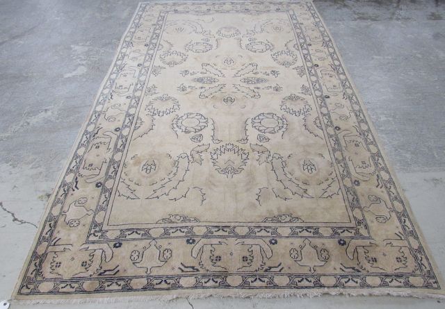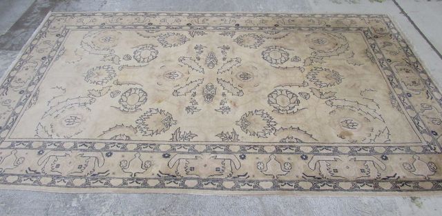 Hand made with wool, acid wash style, has some stains, 6'1 x 10'1. Hand made with wool, acid wash style, has some stains, 6'1 x 10'1.