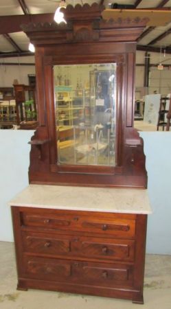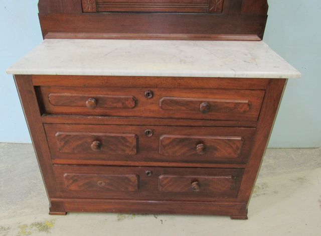 Eastlake style marble top dresser with mirror and candle stands, three drawers, no key, on removable wheels, 83"h., 39"w., 17"d. Eastlake style marble top dresser with mirror and candle stands, three drawers, no key, on removable wheels, 83"h., 39"w., 17"d.