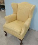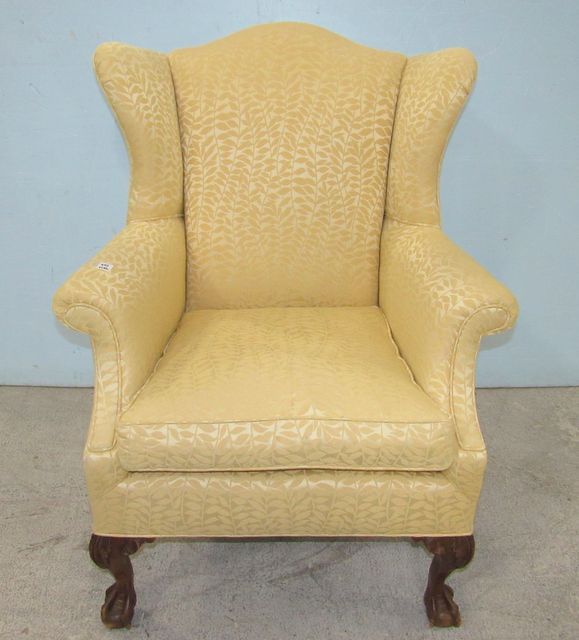 Wing back arm chair, light yellow fabric, ball-n-claw front feet (has wear), 40"h. Wing back arm chair, light yellow fabric, ball-n-claw front feet (has wear), 40"h.