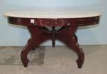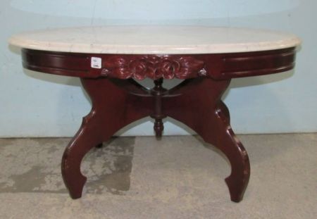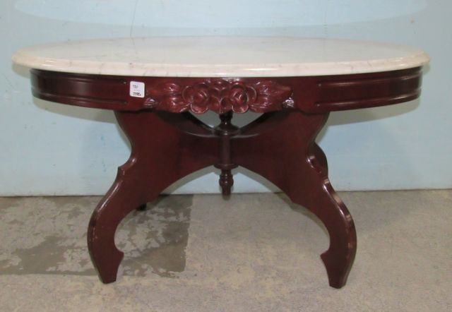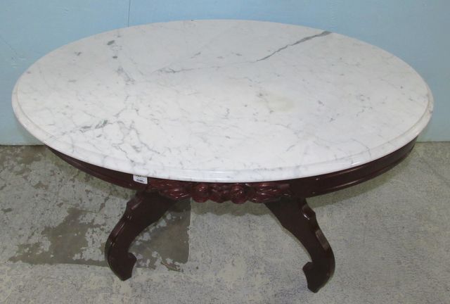 Rose carved coffee table with white marble top, 16"h., 31"w. Rose carved coffee table with white marble top, 16"h., 31"w.