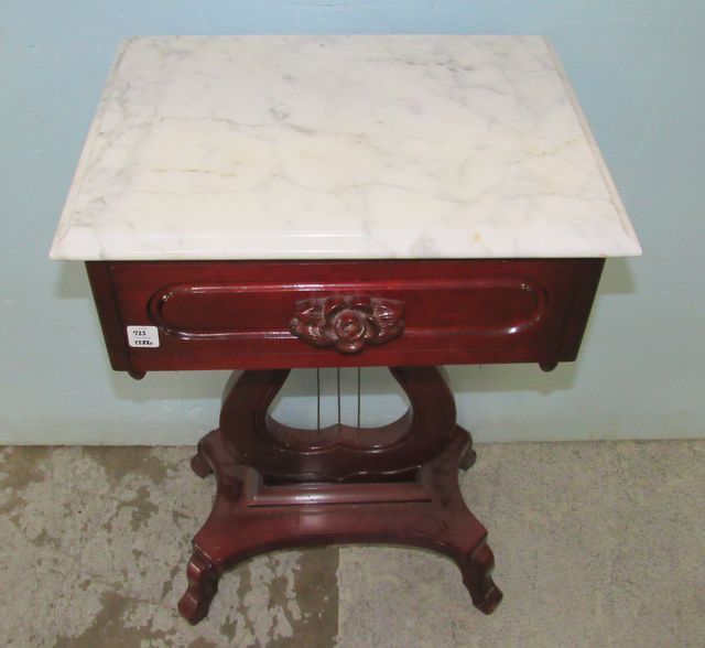 Rose carved night stand with harp pedestal and white marble top, 27"h., 17"w., 13"d. Rose carved night stand with harp pedestal and white marble top, 27"h., 17"w., 13"d.