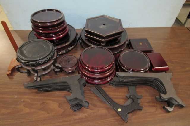 Assorted sized and shapes, stands for plates and vases, over 30 pieces. Assorted sized and shapes, stands for plates and vases, over 30 pieces.
