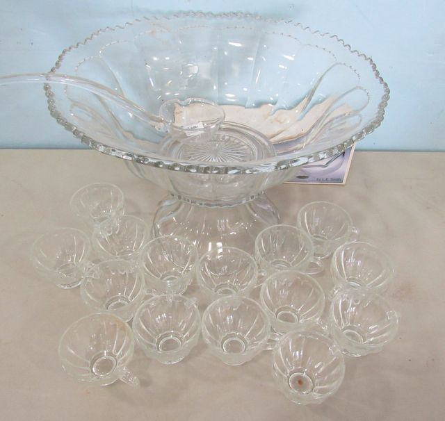 Fifteen cups and two glass ladles, has pedestal, bowl has chip. Fifteen cups and two glass ladles, has pedestal, bowl has chip.