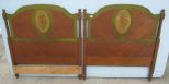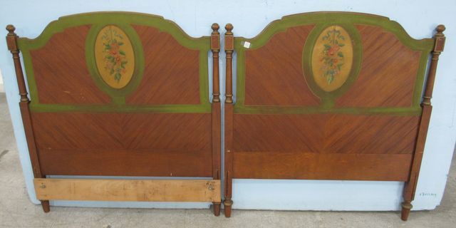 Has wear on walnut finish, floral painted medallion, two headboards with rails, no foot boards. Has wear on walnut finish, floral painted medallion, two headboards with rails, no foot boards.