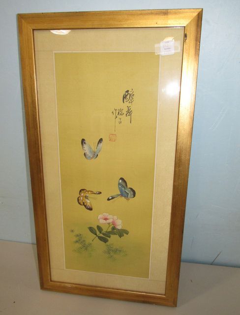 Hand colored, flowers with butterflies, framed, glass front, 14"w., 26"h. Hand colored, flowers with butterflies, framed, glass front, 14"w., 26"h.