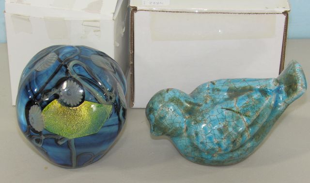 Eickholt (Robert Eickholt) colorful glass paperweight 2003 4"h., pottery age crackling design glazed bird 3"h., 5"w. Eickholt (Robert Eickholt) colorful glass paperweight 2003 4"h., pottery age crackling design glazed bird 3"h., 5"w.