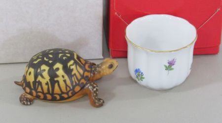 Herend Hungary hand painted porcelain turtle 2007 3 1/2"w., Herend Hungary hand painted vase 2007 2"h. Herend Hungary hand painted porcelain turtle 2007 3 1/2"w., Herend Hungary hand painted vase 2007 2"h.