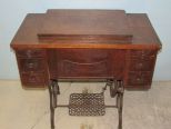 Oak sewing cabinet with Bruce Rotary sewing machine, foot peddle, six drawers, 32"h., 34"w. Oak sewing cabinet with Bruce Rotary sewing machine, foot peddle, six drawers, 32"h., 34"w.