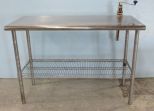 Two tier stainless table, has wear, 34"h., 50"w., 24"d. Two tier stainless table, has wear, 34"h., 50"w., 24"d.