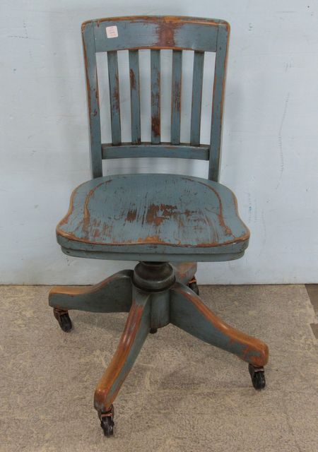 Painted distressed wood desk chair on wheels, 32"h. Painted distressed wood desk chair on wheels, 32"h.