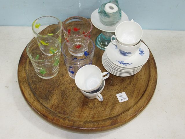 Royal Copenhagen blue flower espresso cup and saucers, 16" handcrafted lazy Susan, Swimming fish yellow tumbler, blue, orange, green, 3", Whimsical glass bird tea light holder on a bird bath, 6"h., 4"w. Royal Copenhagen blue flower espresso cup and saucers, 16" handcrafted lazy Susan, Swimming fish yellow tumbler, blue, orange, green, 3", Whimsical glass bird tea light holder on a bird bath, 6"h., 4"w.