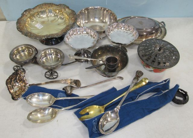 Towle "Old Master" embossed compote 4"h., 11"dia., forks, spoons, Ladle, serving spoons, candle snuffer, Paul Revere reproduction bowl, Reed & Barton serving bowl, Meat dish with monogram, two compotes, FB Rogers silver plate wagon server. Towle "Old Master" embossed compote 4"h., 11"dia., forks, spoons, Ladle, serving spoons, candle snuffer, Paul Revere reproduction bowl, Reed & Barton serving bowl, Meat dish with monogram, two compotes, FB Rogers silver plate wagon server.