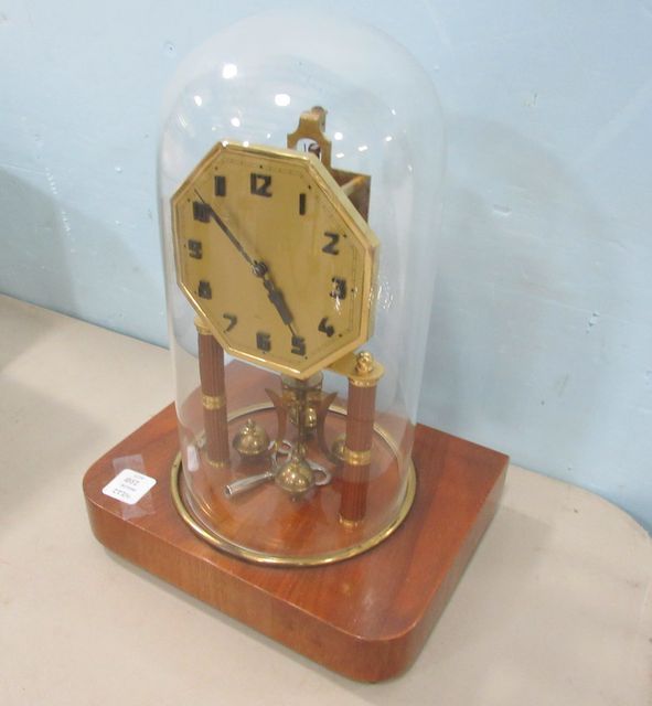 Glass dome, key, pendulum, cord to pendulum is damaged, wood base, 12"h. Glass dome, key, pendulum, cord to pendulum is damaged, wood base, 12"h.