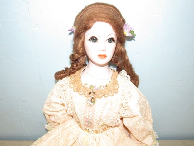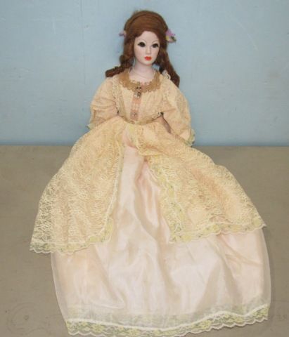 32"h., porcelain and cloth body, right foot glued on. 32"h., porcelain and cloth body, right foot glued on.