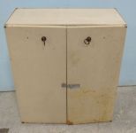 Two door storage cabinet, has wear, 30"h., 27"w., 13"d. Two door storage cabinet, has wear, 30"h., 27"w., 13"d.