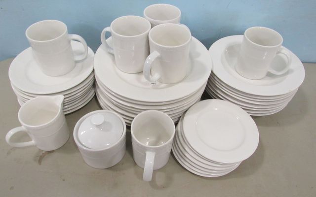Nine dinner plates (has chip), eight bowls (has chip), nine salad plates, seven dessert plates (has chip), sugar, creamer, six mugs. Nine dinner plates (has chip), eight bowls (has chip), nine salad plates, seven dessert plates (has chip), sugar, creamer, six mugs.
