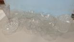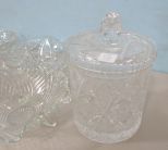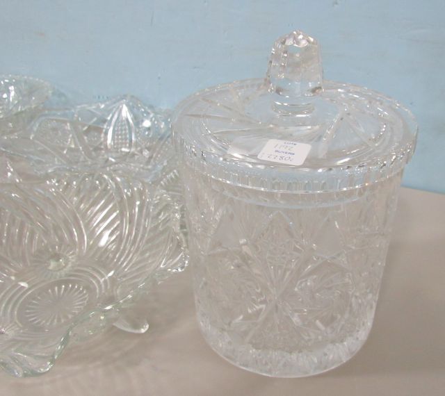 Pinwheel etched covered jar, four pressed glass bowls, bowls, divided dish, footed bowls, vase. Pinwheel etched covered jar, four pressed glass bowls, bowls, divided dish, footed bowls, vase.