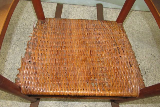 Rocking arm chair, spindle back, wicker seat is damaged, 33"h. Rocking arm chair, spindle back, wicker seat is damaged, 33"h.