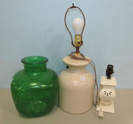 Ceramic crock lamp, small ceramic desk lamp, Green glass vase 12"h. Ceramic crock lamp, small ceramic desk lamp, Green glass vase 12"h.