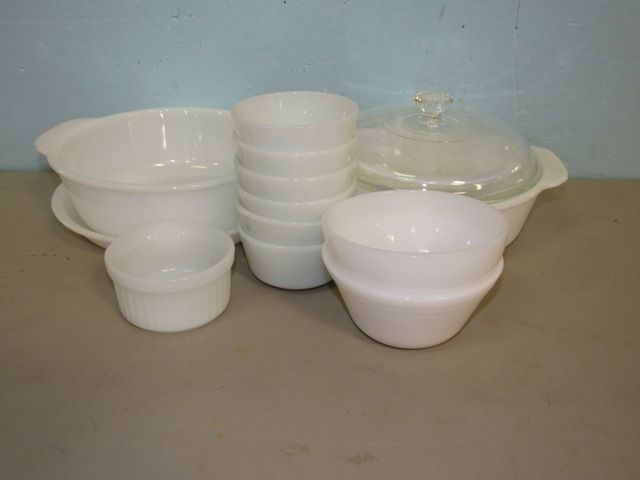Casserole, pie plate, two cereal bowls, six fruit bowls, one ramkin. Casserole, pie plate, two cereal bowls, six fruit bowls, one ramkin.
