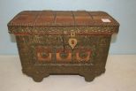 Lift top, brass embossed, inlaid trim, on wheels, has wear, 10"h., 14"w. Lift top, brass embossed, inlaid trim, on wheels, has wear, 10"h., 14"w.