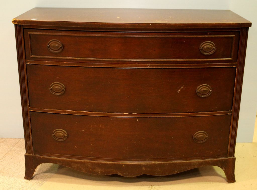 Duncan Phyfe three drawer low chest, has damage on one corner.; 45" w., 21" h., 34 1/2" h. Duncan Phyfe three drawer low chest, has damage on one corner.; 45" w., 21" h., 34 1/2" h.
