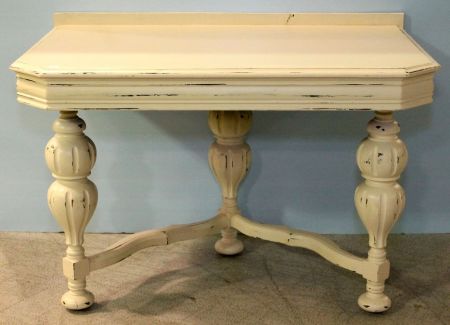 White distressed table with splash back; 45" w., 31" h., 30 1/2" d. White distressed table with splash back; 45" w., 31" h., 30 1/2" d.
