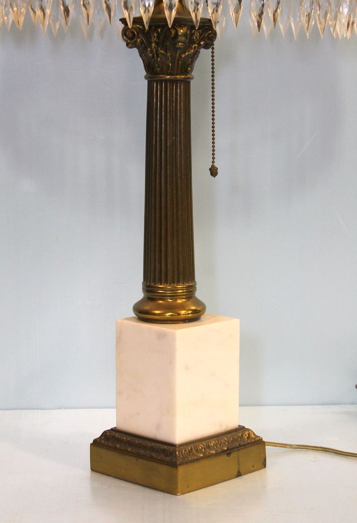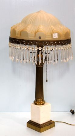 French Vienne table lamp with deco style glass shade and marble and brass column base.; 15" dia., 30" h. French Vienne table lamp with deco style glass shade and marble and brass column base.; 15" dia., 30" h.
