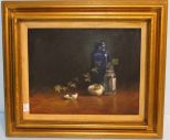 Oil on canvas of blue bottle, ivy and garlic. Signed lower right Bill Wilson '99. Wilson is a nationally recognized portrait artist.; 20" w., 17 1/2" h. Oil on canvas of blue bottle, ivy and garlic. Signed lower right Bill Wilson '99. Wilson is a nationally recognized portrait artist.; 20" w., 17 1/2" h.